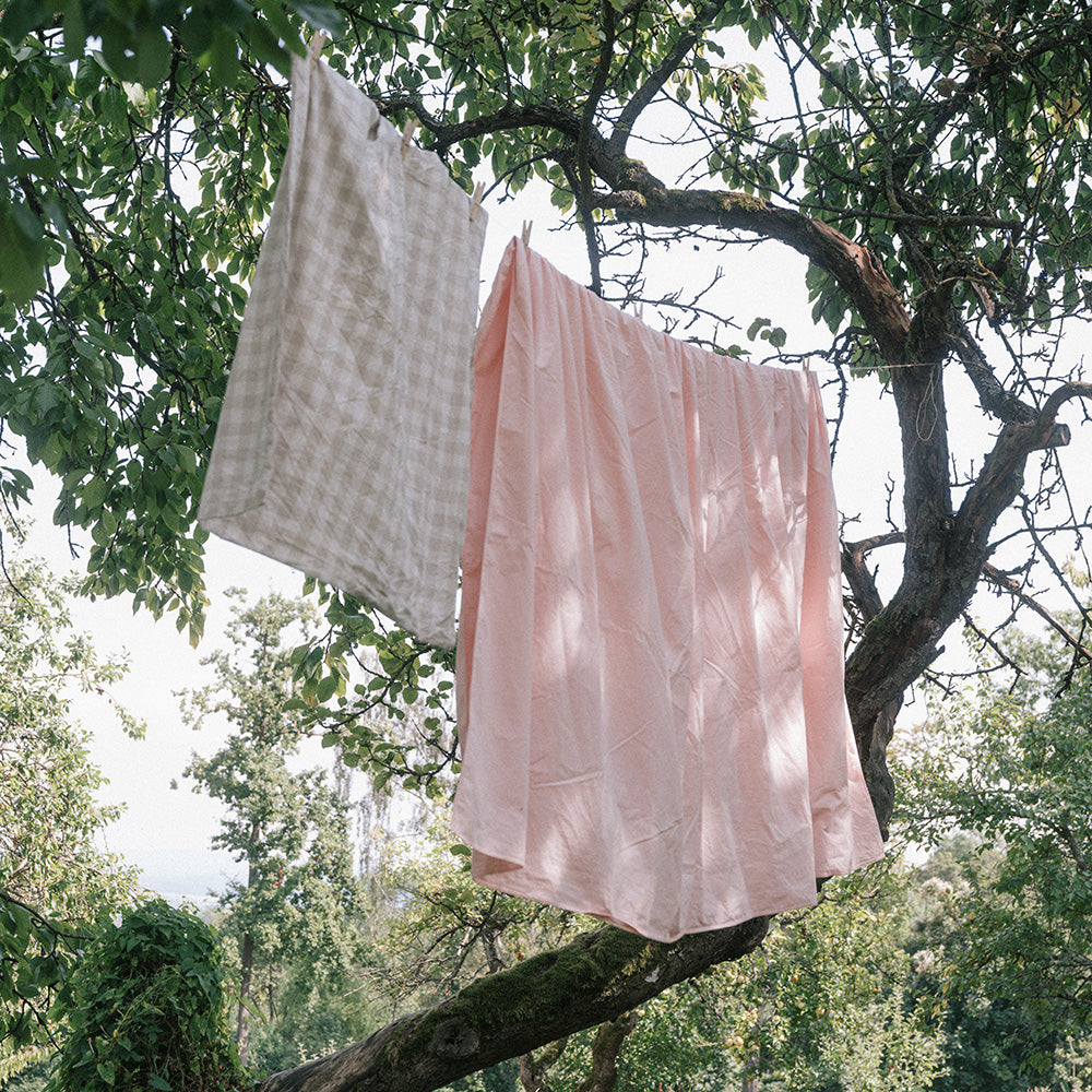 Am wohlsten fühlt sich Perkal auf der Leine. Für ein glatteres Ergebnis lohnt es sich, die noch feuchte Wäsche vor dem Aufhängen auszuschütteln und sanft in Form zu ziehen. Alternativ kannst du sie bei niedrigen bis mittleren Temperaturen im Trockner trocknen.