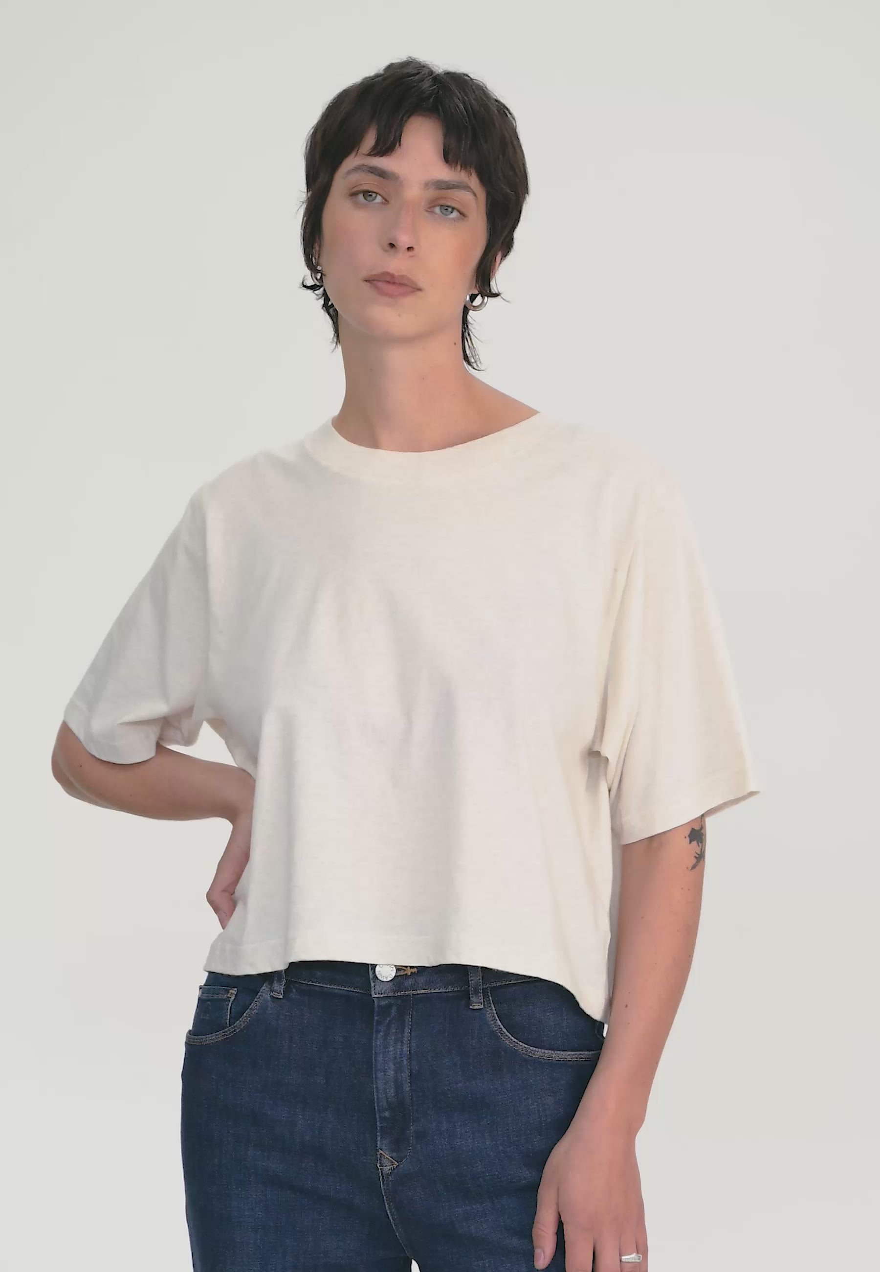 Dieses lässige T-Shirt, besticht durch eine kastige Cropped-Passform. Abgerundet wird der lässig-moderne Look durch die Oversized-Passform, den hohen und runden Ausschnitt sowie die feinen Rippbündchen und angesetzten Nähte.
